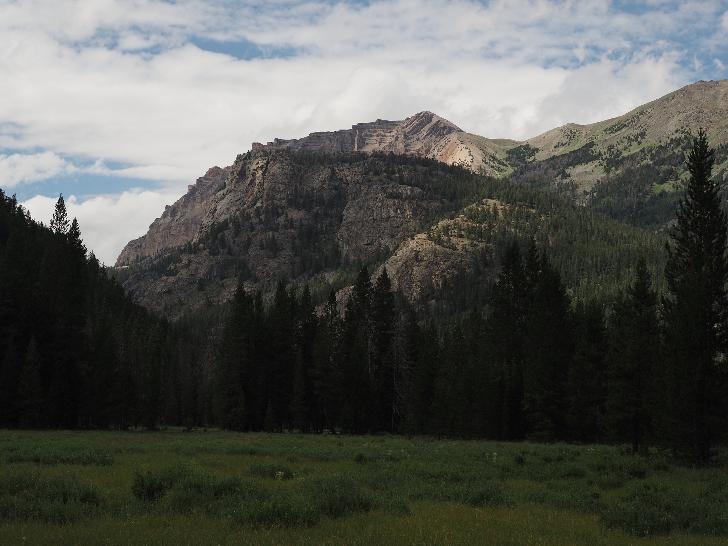 The next obvious stopping point was at Three Forks Park, a long meadow through which the Green River meanders. By this point, had traveled 12.1 miles, during which we had gently gained about 350’–probably a little more with various ups and downs. Despite the gentle day, we were ready to stop, and the area looked beautiful. It took us some time to find a good site: an appropriate distance from the water, a surface on which we would not impact the meadow, and where we’d give some distance from other backpackers. We ended up tucking into a small spot, sheltered by trees, on the southeastern side of the meadow.