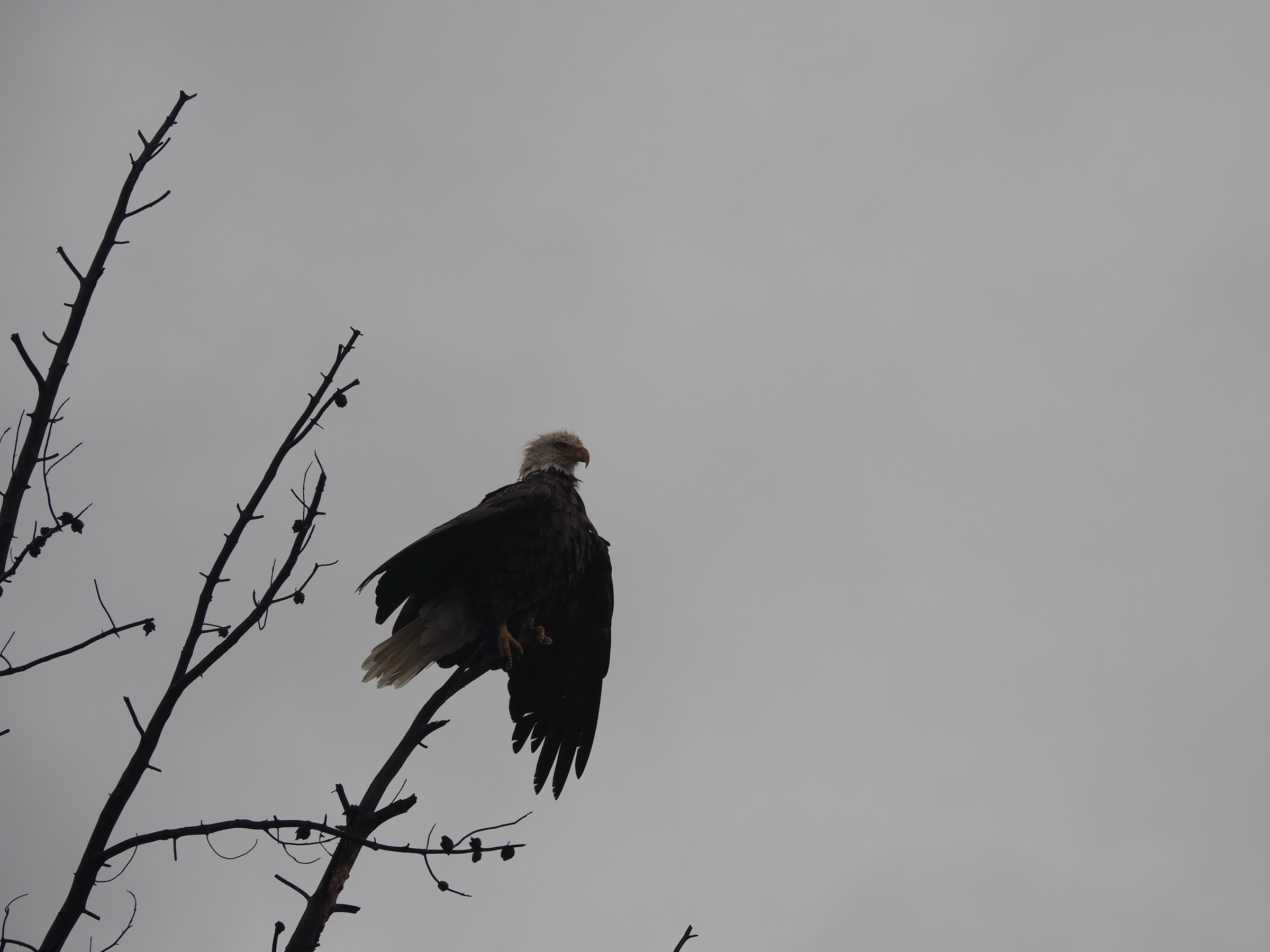 The rain let up as we started the drive out. A bald eagle sat on a tree, turned into the wind, with its wings out, also working to dry itself. We empathized.
