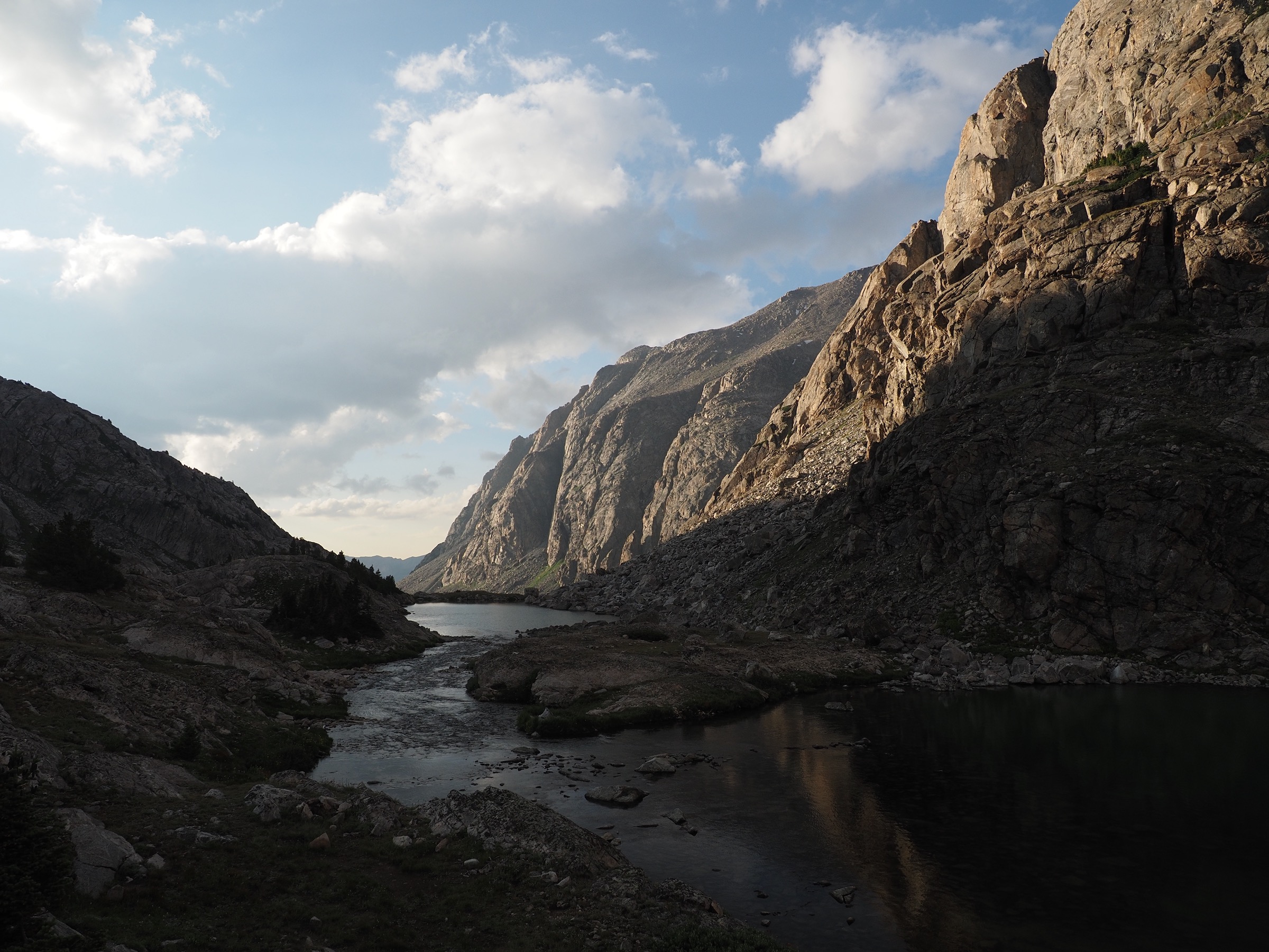 Throughout dinner, I kept looking east, to Knapsack Col. We had been on the other side, in Titcomb Basin, in 2020. That year, storms had kept us from ascending the other side of the col for the view. In the afternoon, we had talked about ascending, but the forecast had indicated storms. We did not want to get caught up there in a thunderstorm, so we had decided not to–though no storms appeared in our area. The forecast for the next day looked equally uncertain, so we resigned ourselves to seeing how things looked in the morning.