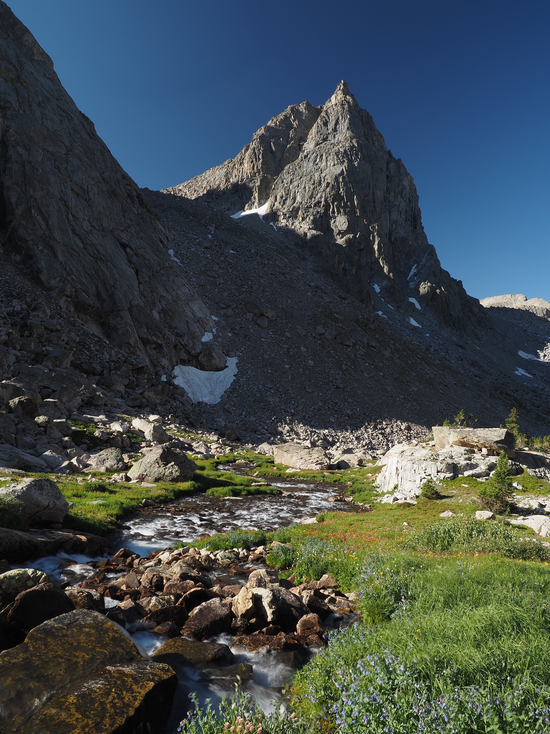 We ascended over rock and amid patches of wildflowers, criss-crossing small streams and walking next to green-blue pools. To the south, Sulphur Peak, Brimstone Mountain, Bow Mountain, and Mount Arrowhead loomed over us. Ahead, Knapsack Col, American Legion Peak, Winifred Peak, and Twin Peaks grew steadily closer.