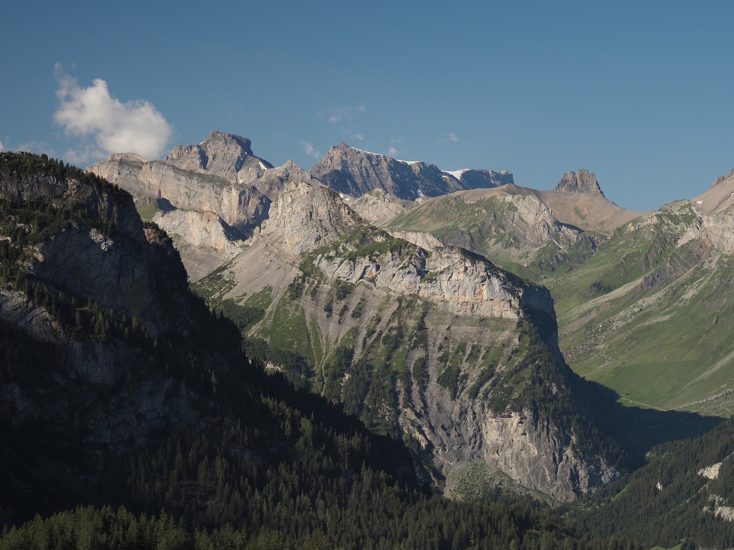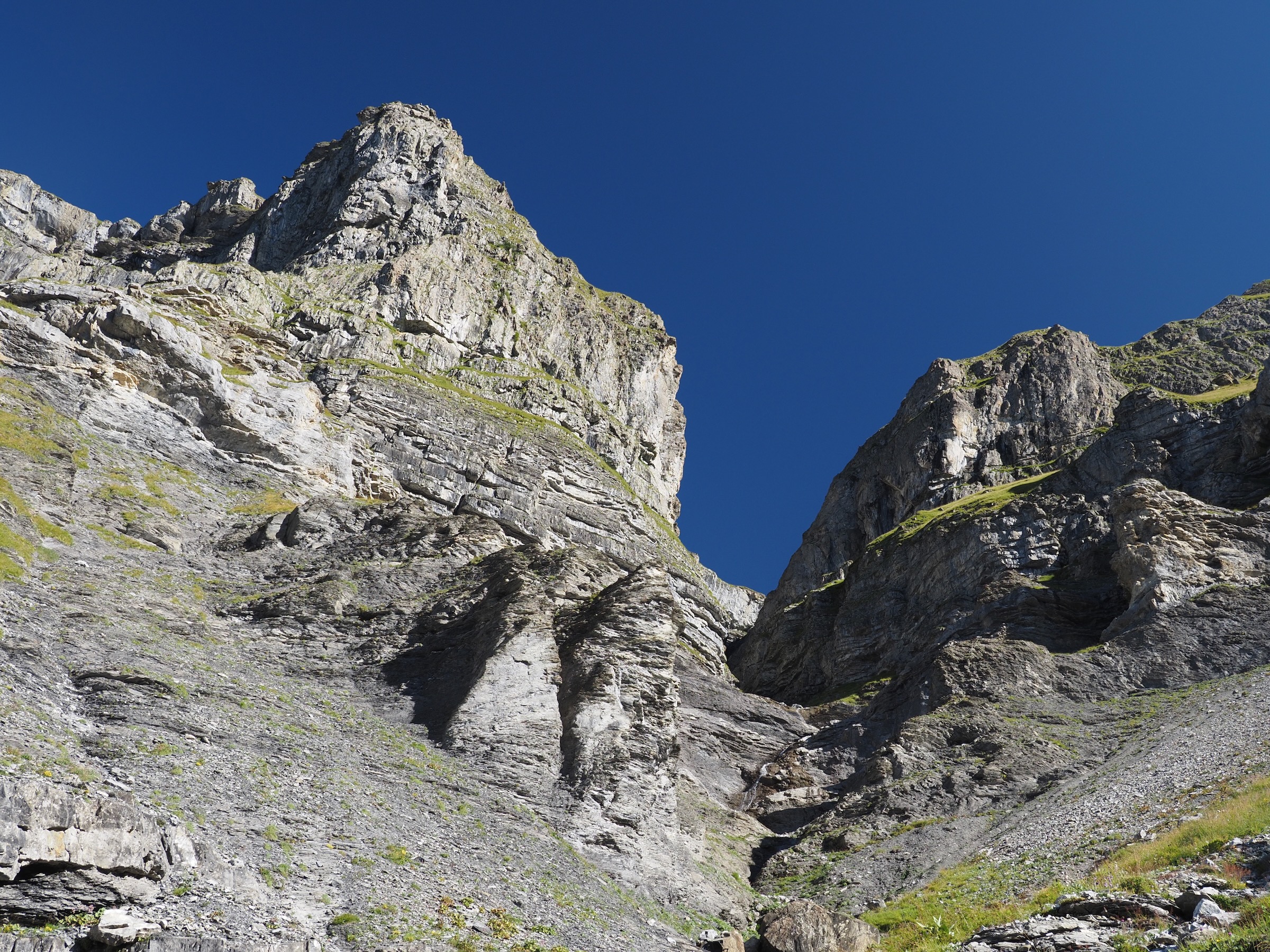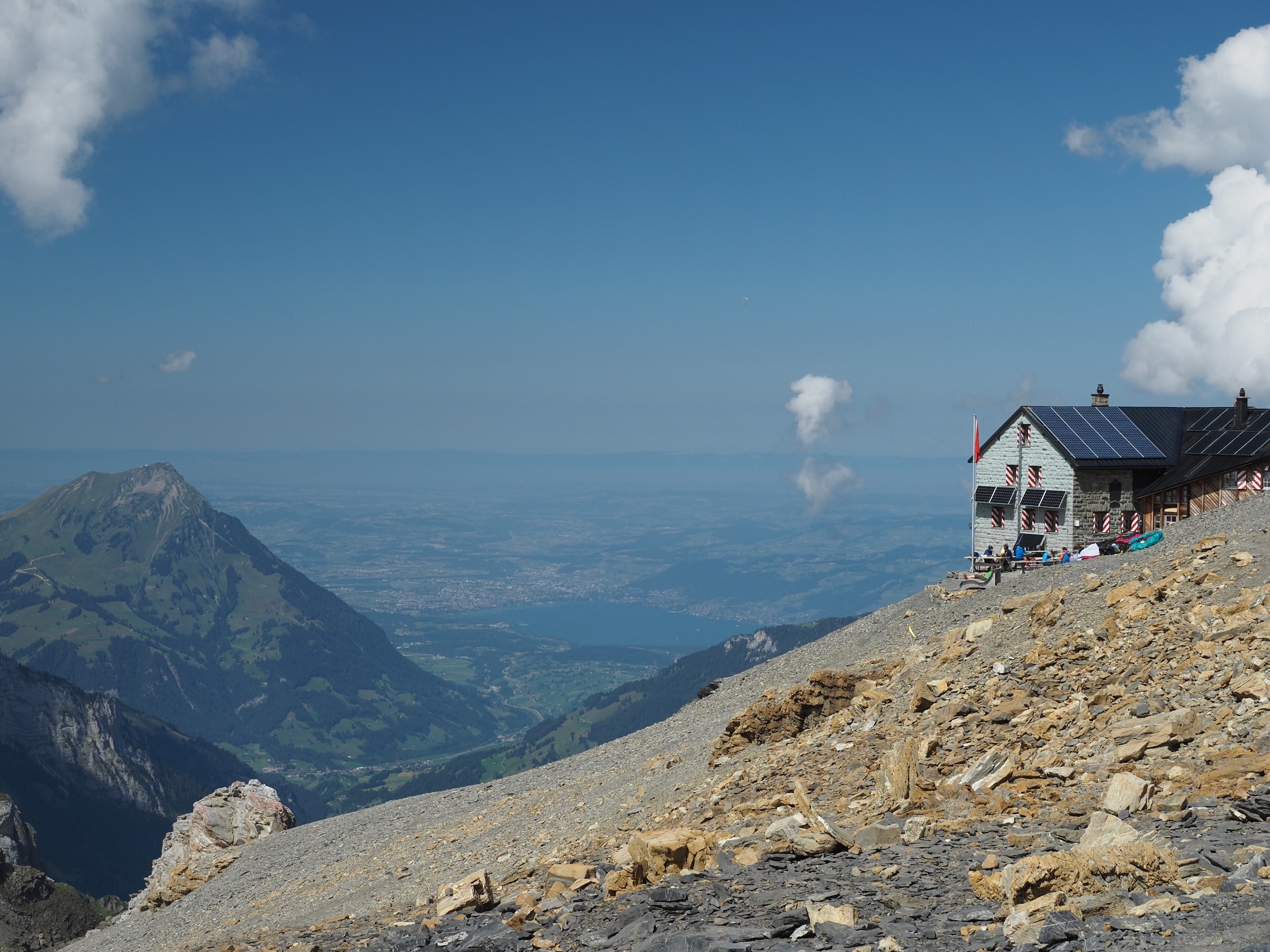 With the excellent weather, though, we just kept walking and enjoying the views. Before we knew it, we were on the last slope below the hut. At that point, it seemed like a missed opportunity not to go, and so we continued on. From the hut, we enjoyed views of the peaks and down to Thunersee (Lake Thun) in the distance.