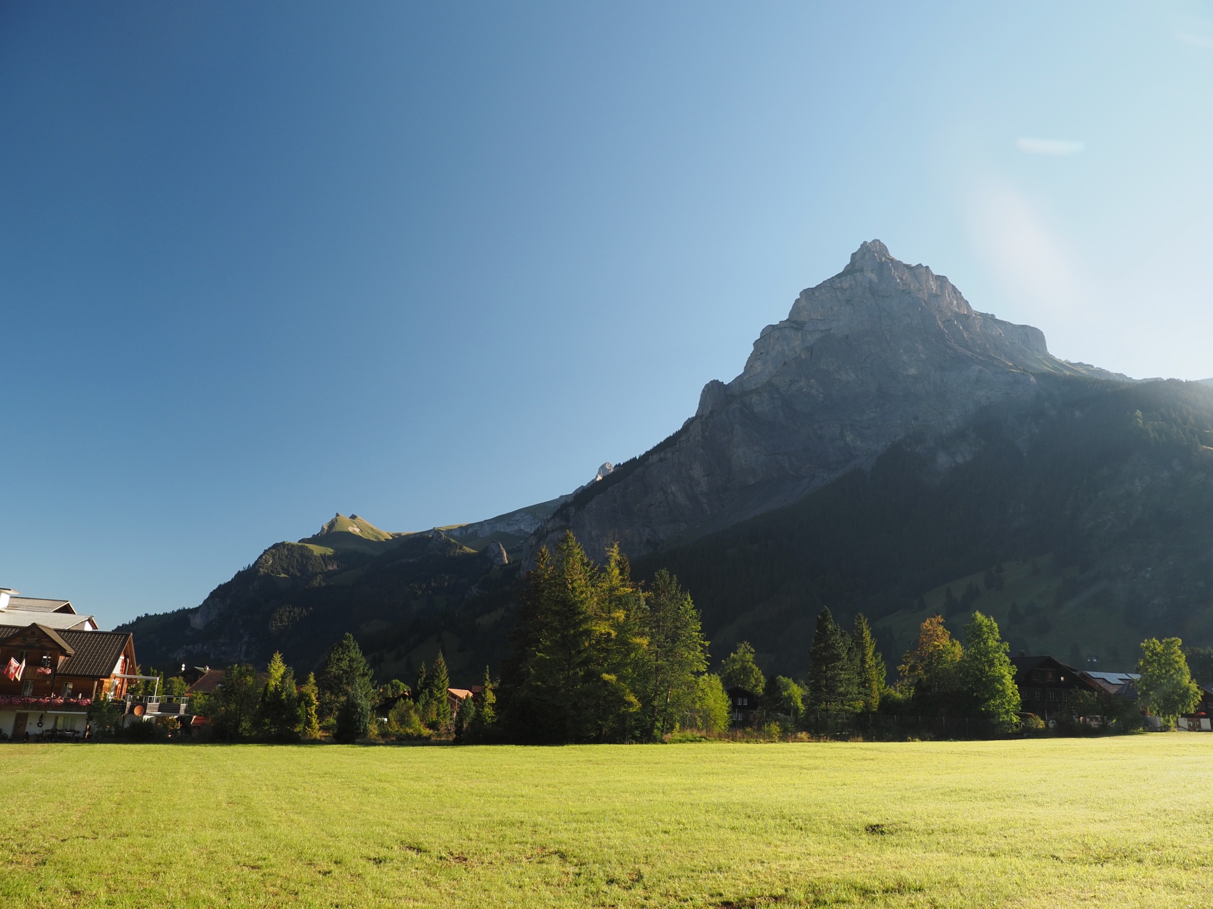 The hike down went much faster than the hike up. We were surprised by how fast we reached the lake and then the buildings at its western edge. Our return route brought us down to the lake shore, and the sun illuminated cliffs on the opposite side of the lake. We considered stopping for a snack or drink here, but decided we might get a more substantive meal at better prices back in Kandersteg. Our total hike had been about 9.3 miles and 4379′ of elevation gain.