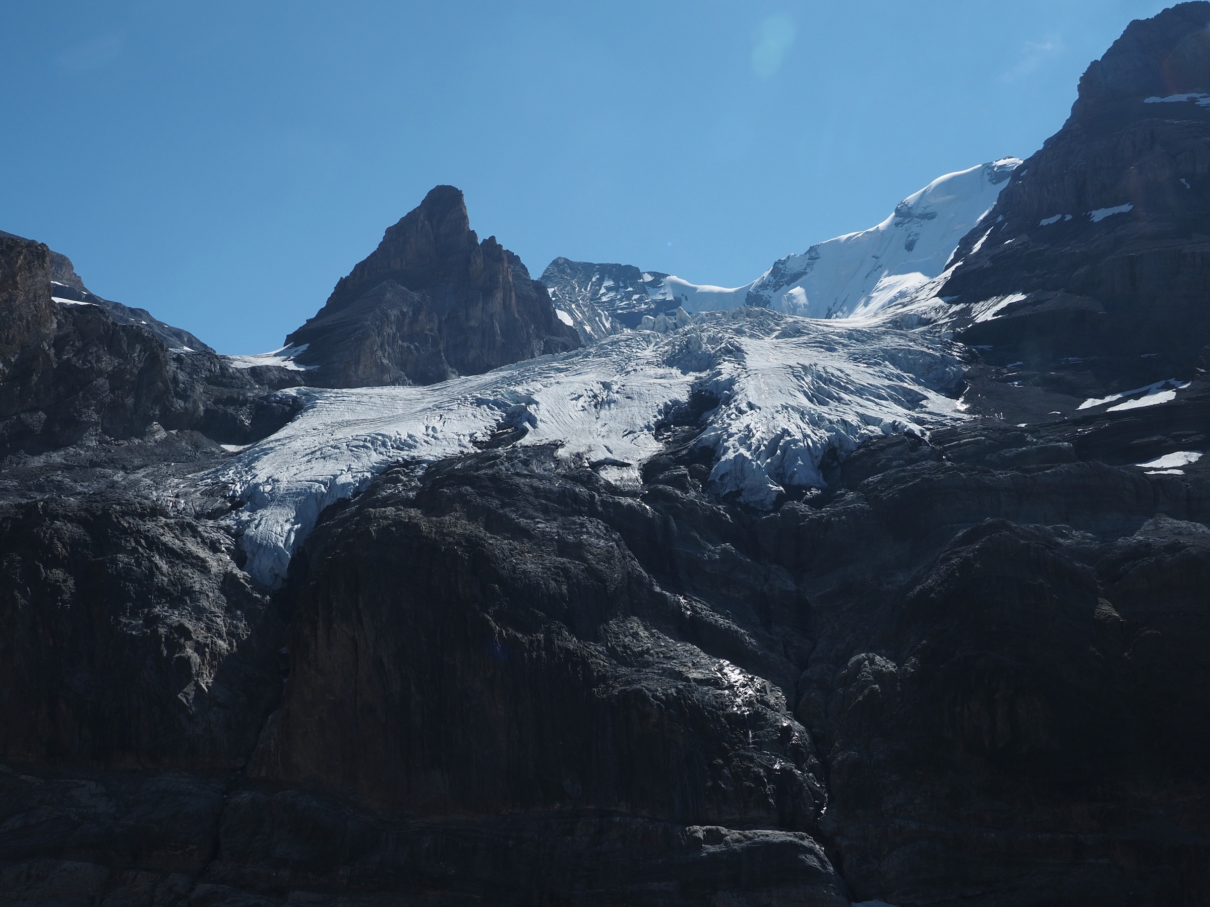 Before descending, we headed just a bit higher beyond the hut. This gave us better views of Blüemlisalp Glacier and the nearby peaks. The area around the hut had a festive feeling, with parasailers launching, climbers returning from higher ascents, and lots of day hikers picnicking.