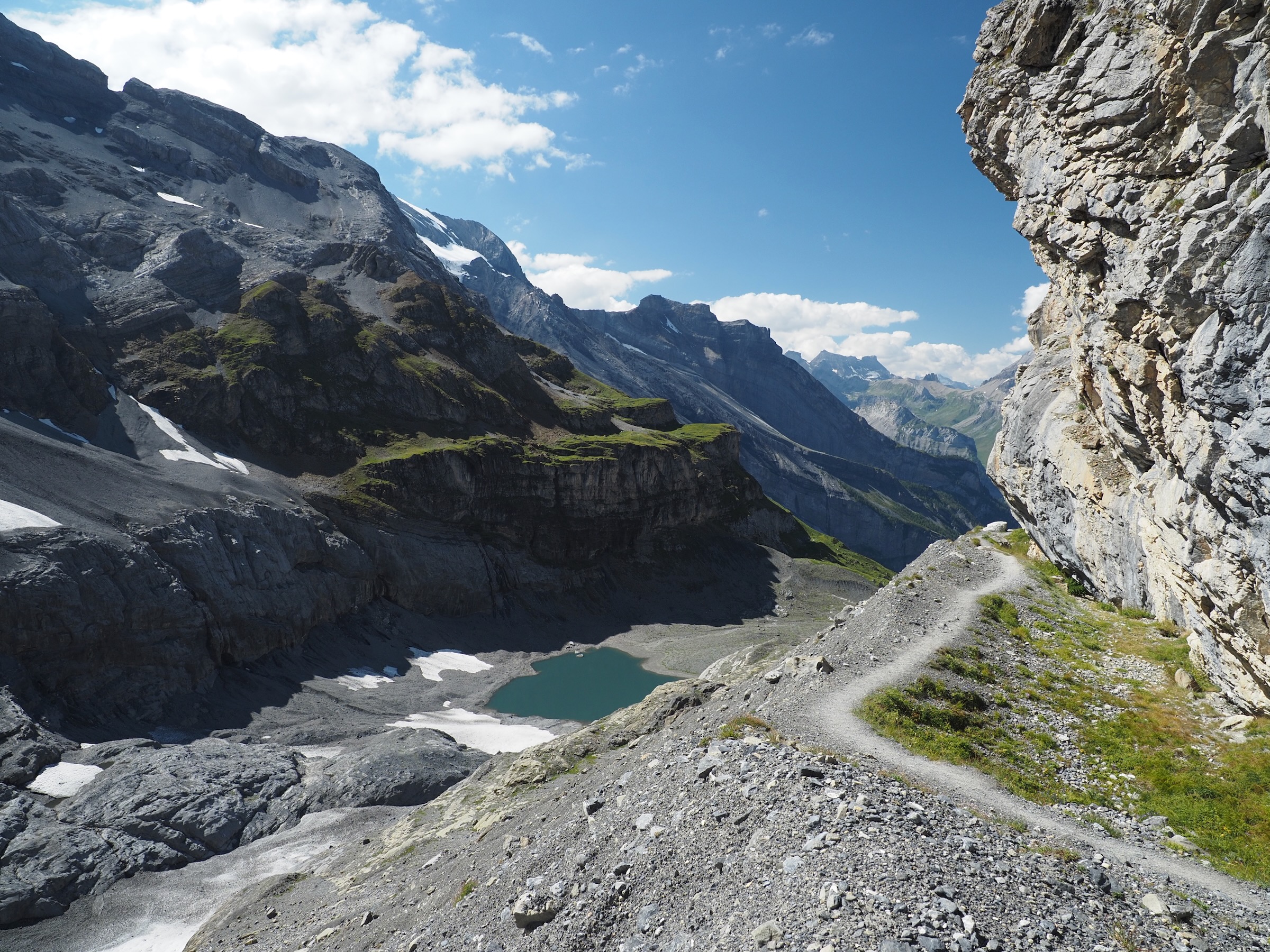 The trail led to a moraine, with another lake–Rossbode See–below us on the right. Above us, we could see Blüemlisalphütte in the distance. We joked about continuing on to the hut, but it seemed farther and higher than we’d want to go that day.
