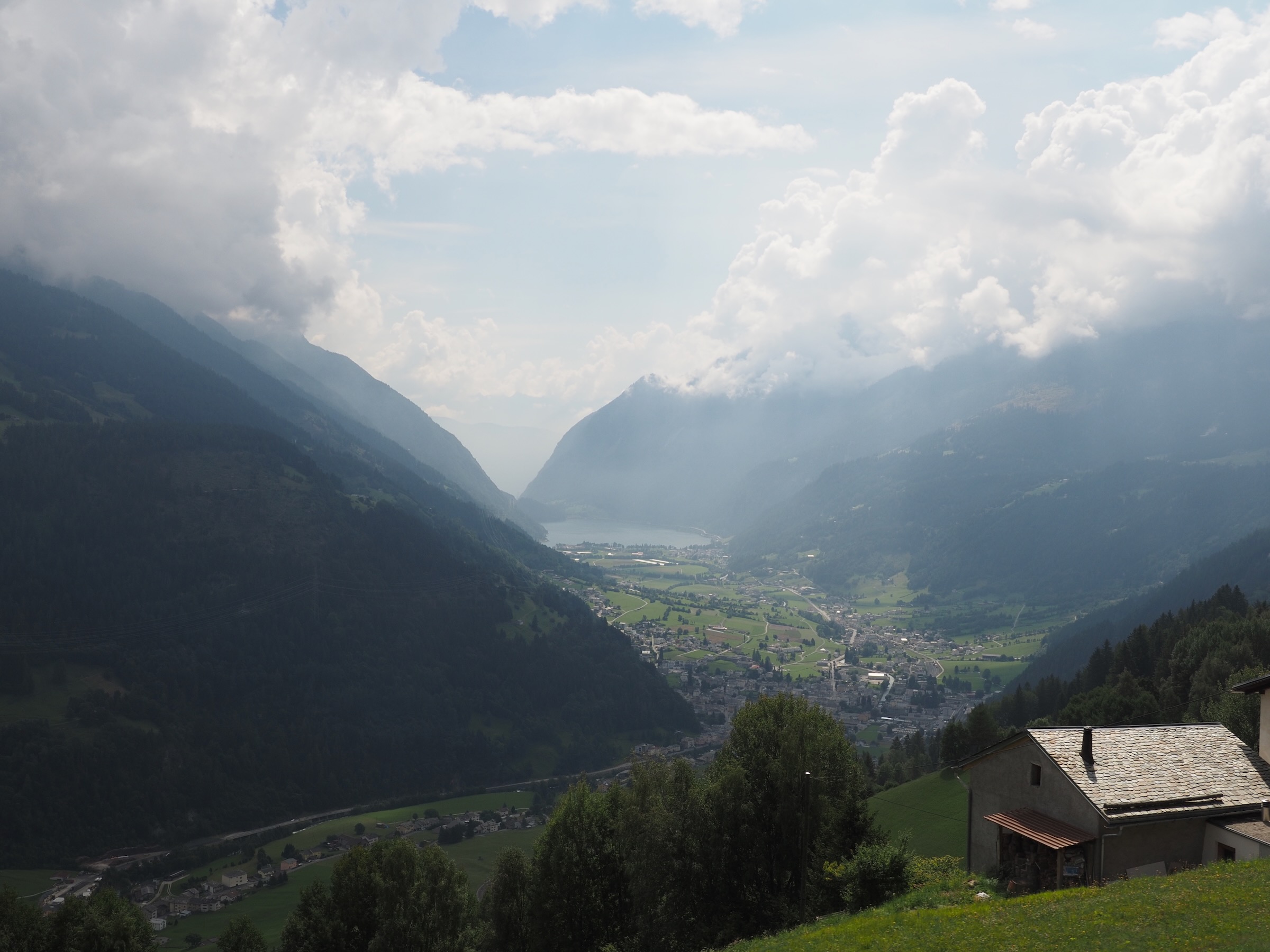 By the time we reached Pontresina, it was drizzling and the forecast more definitively called for storms. The weather on the southern side of the pass looked better, so we decided to stay on the train. From Pontresina, and especially over the Bernina pass and down into Poschiavo, the route paralleled the later parts of our planned circuit, giving us a bit of a preview.